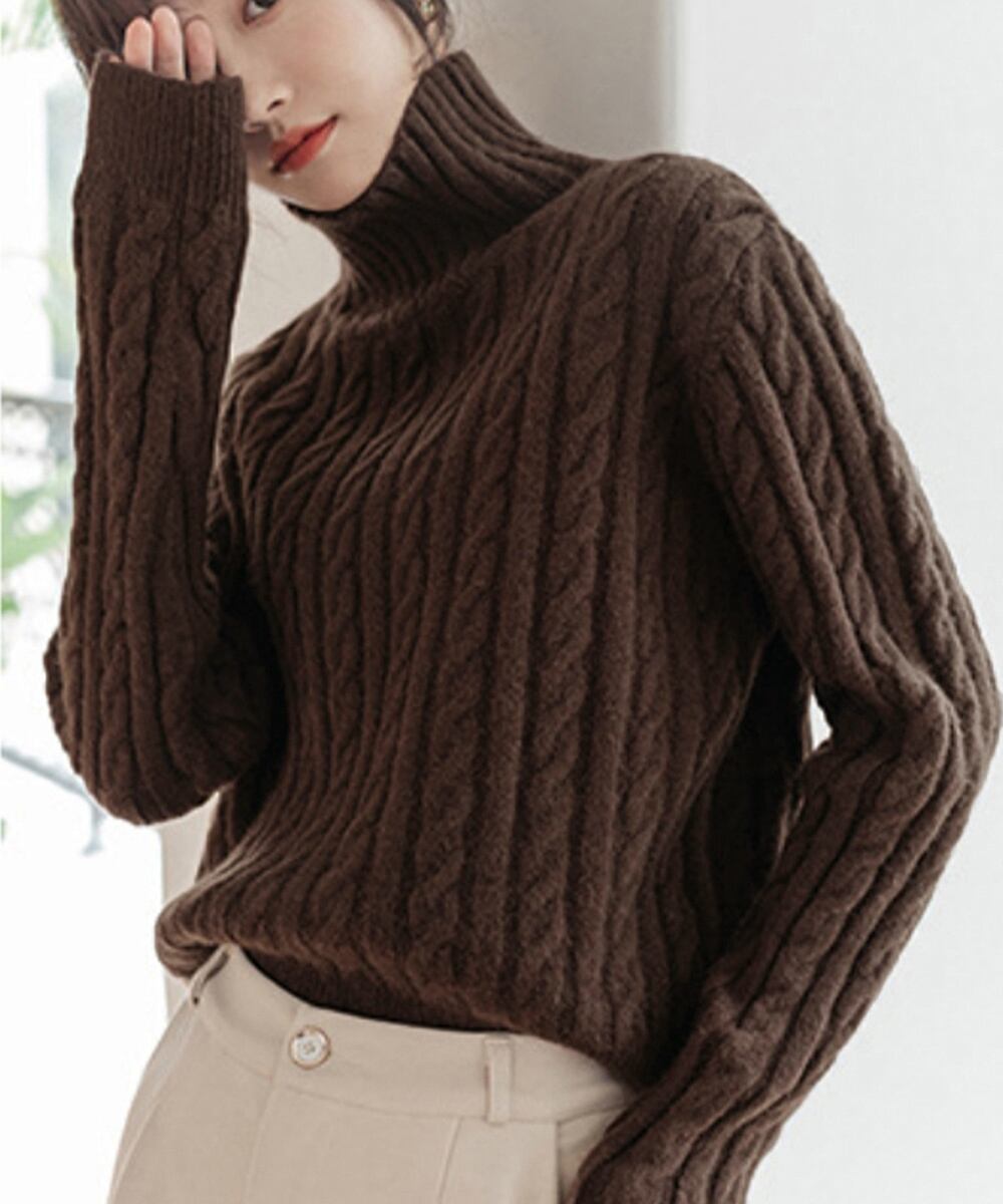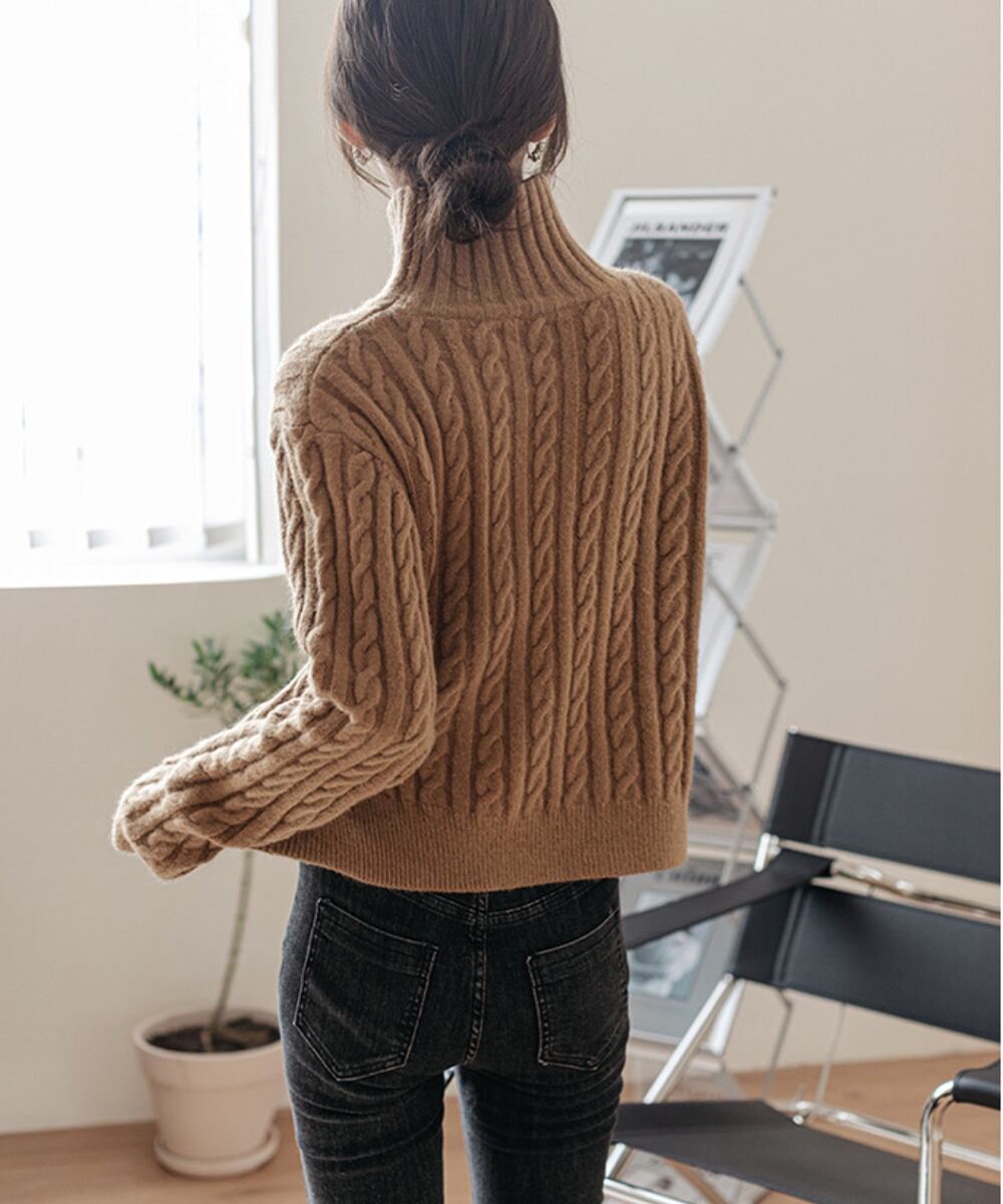 タートルネックが首元を暖かく包み込み、寒い季節に最適です。