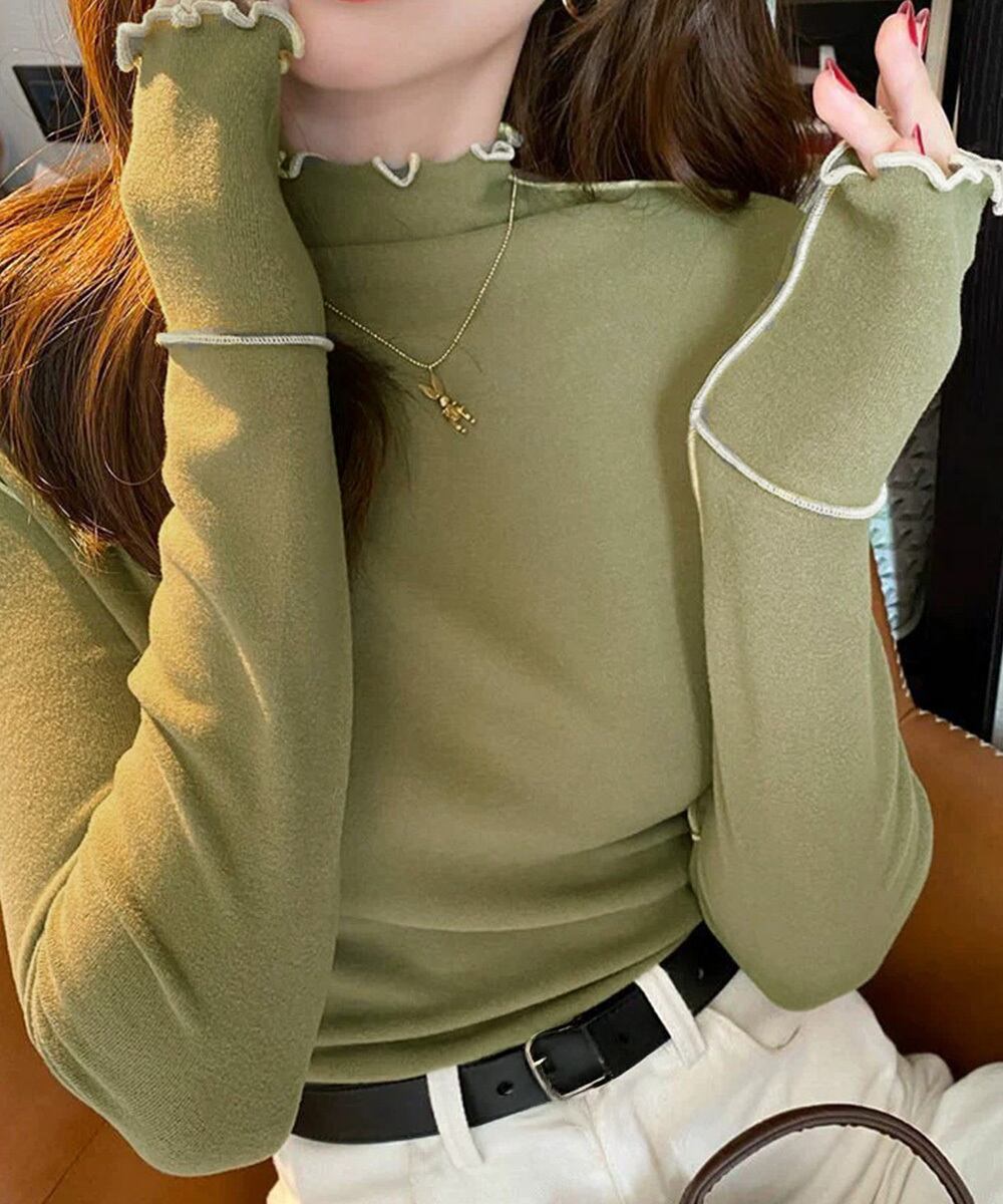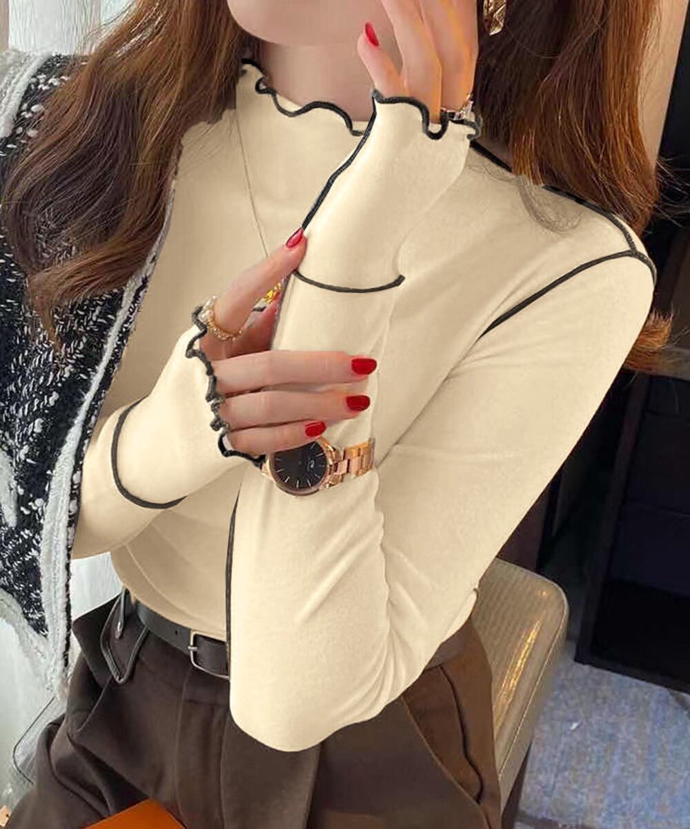 レディース おしゃれ 長袖カットソー プチハイネック 暖か 着やせ 秋冬 ストレッチTシャツ フリル衿 インナートップス