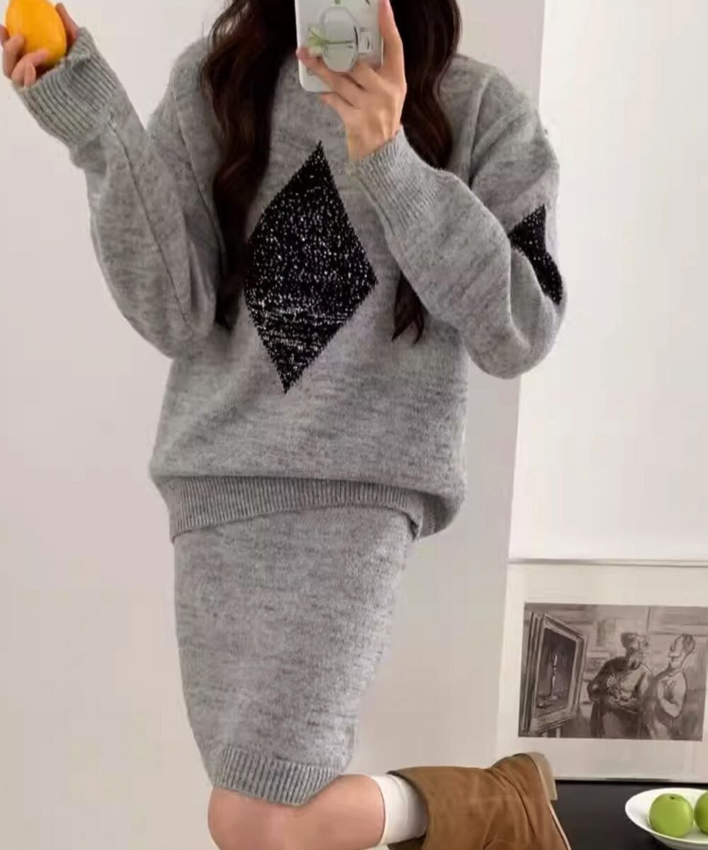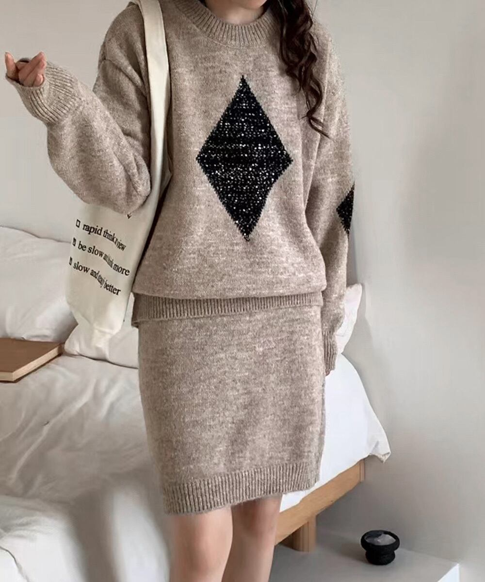 韓国風きらきらニット上下セット レディース 菱形モチーフニットトップス長袖 ニットミニスカート おしゃれ 秋冬ツーピース