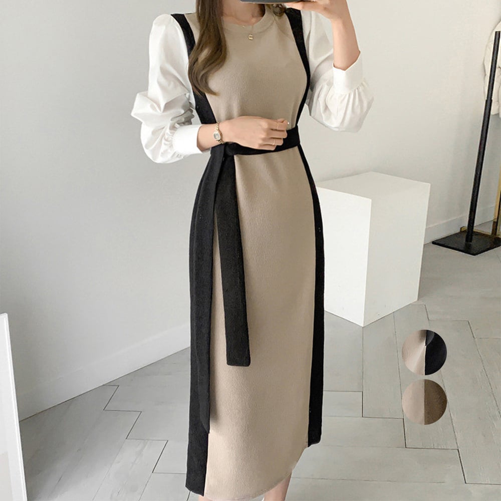 袖切り替え ニットワンピース ロング配色