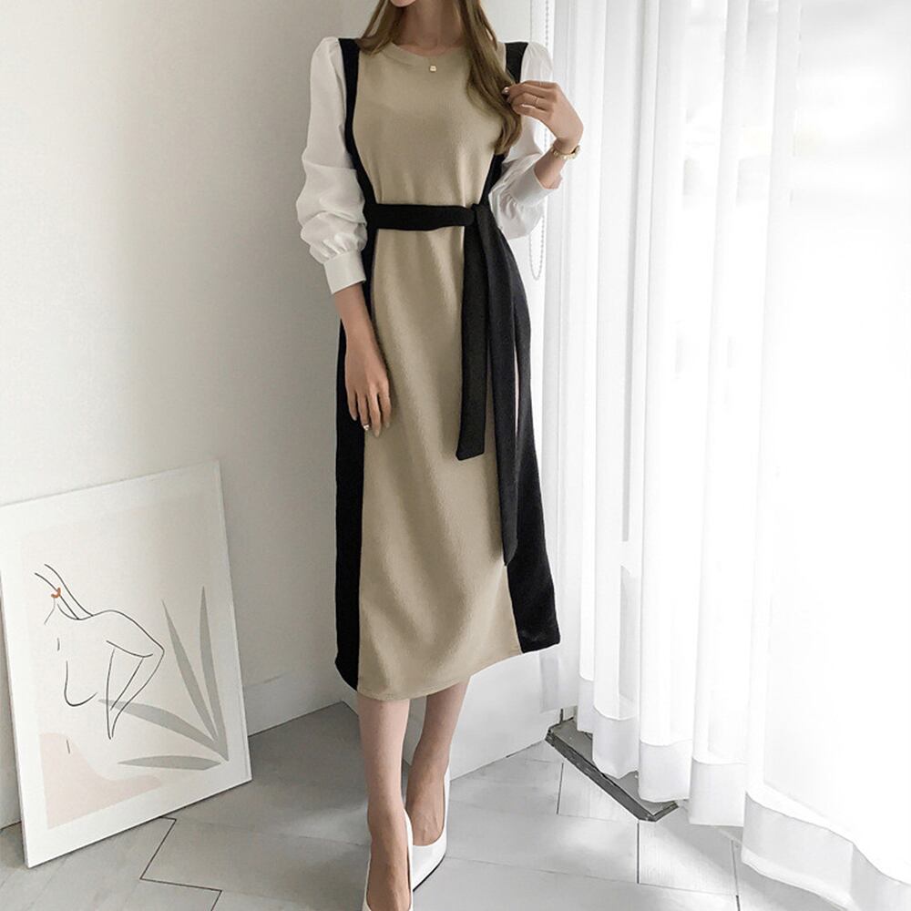 レディース オシャレ カットソーワンピース バイカラー ウエストマーク 長袖ワンピ パフスリーブ フェミニン レトロ風