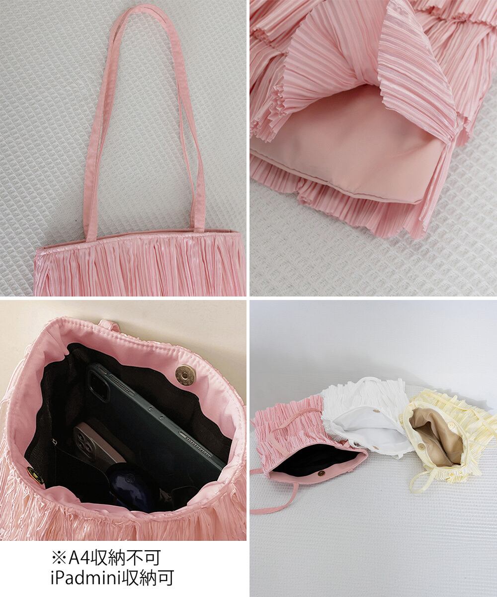 華やかなフリルが目を引くプリーツデザイントートバッグ。