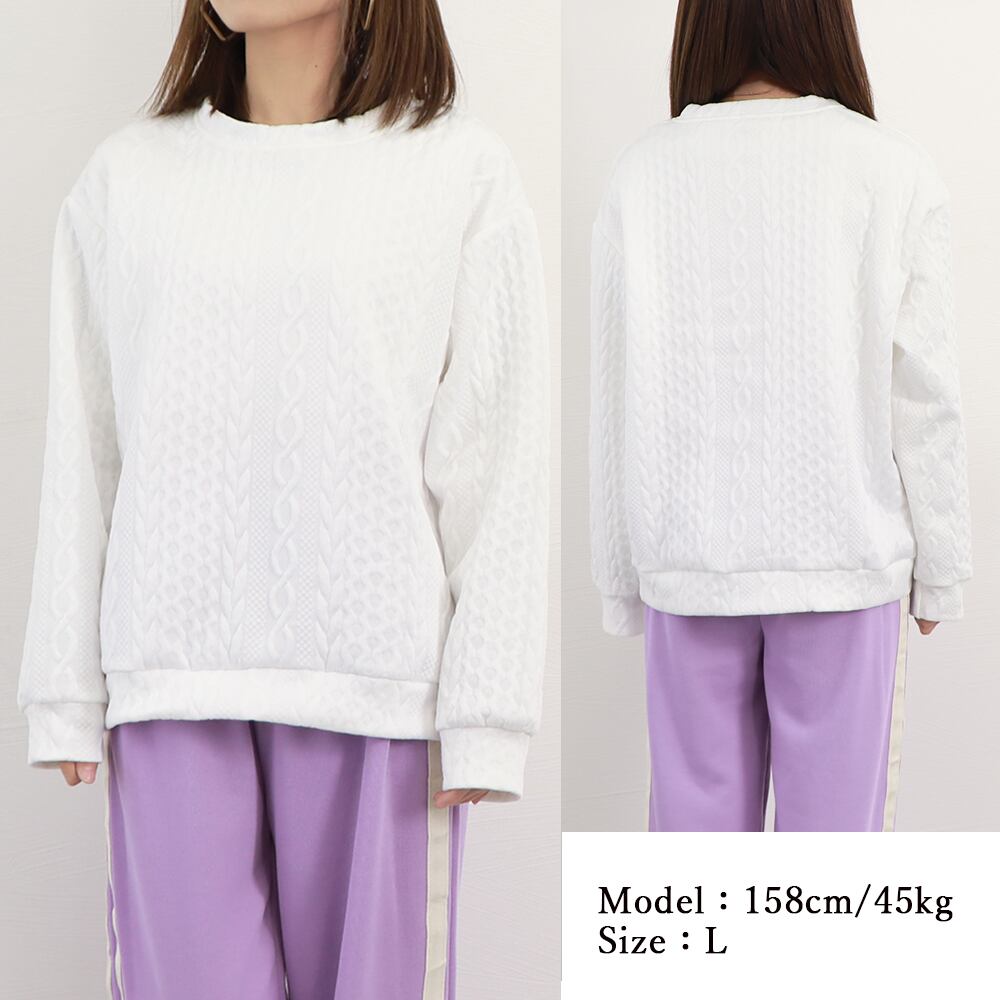 カジュアルなゆったり感と型押しのデザインで大人可愛いスウェットトレーナー
