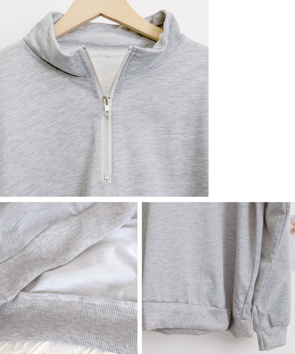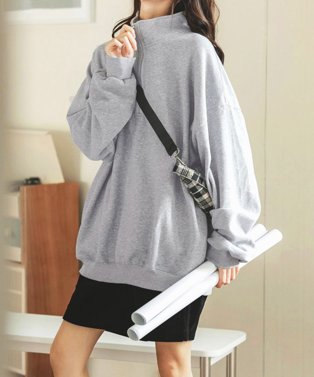 ハーフジップがアクセント、首元の開け閉めで、抜け感のあるコーデから防寒対策まで自在に対応