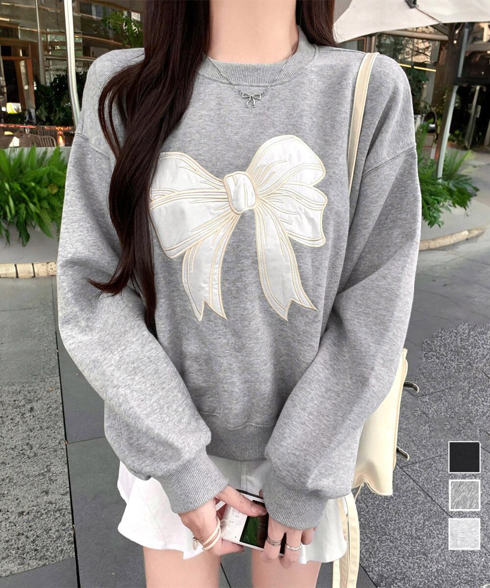 フロントに大きなリボンの刺しゅうを施し、フェミニンで可愛らしい印象を演出するスウェット