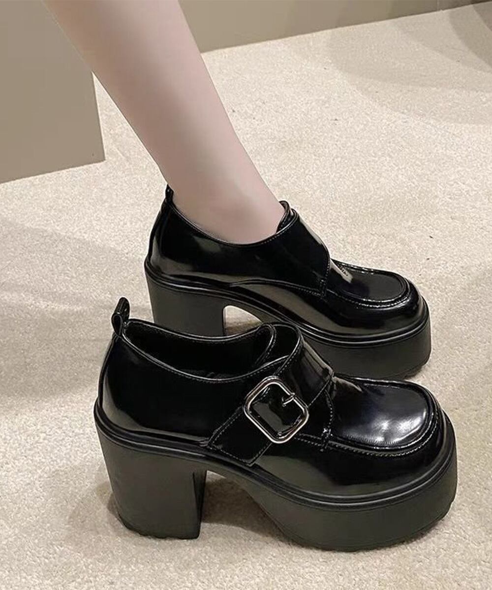 ワンベルトバックル ローファー 歩きやすいラウンドトゥシューズ メイド靴 美脚脚長お嬢様パンプス ヒール9cm疲れない