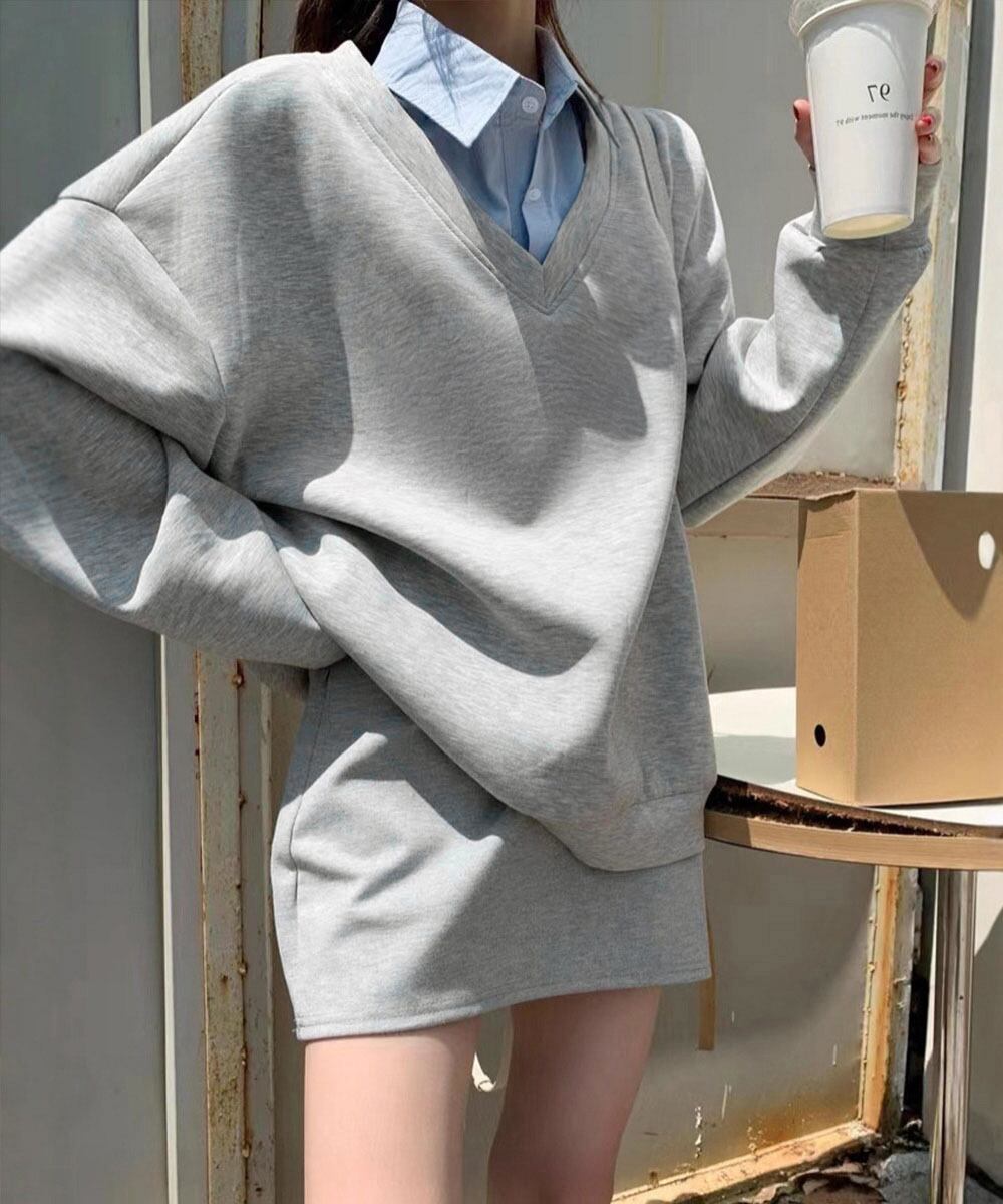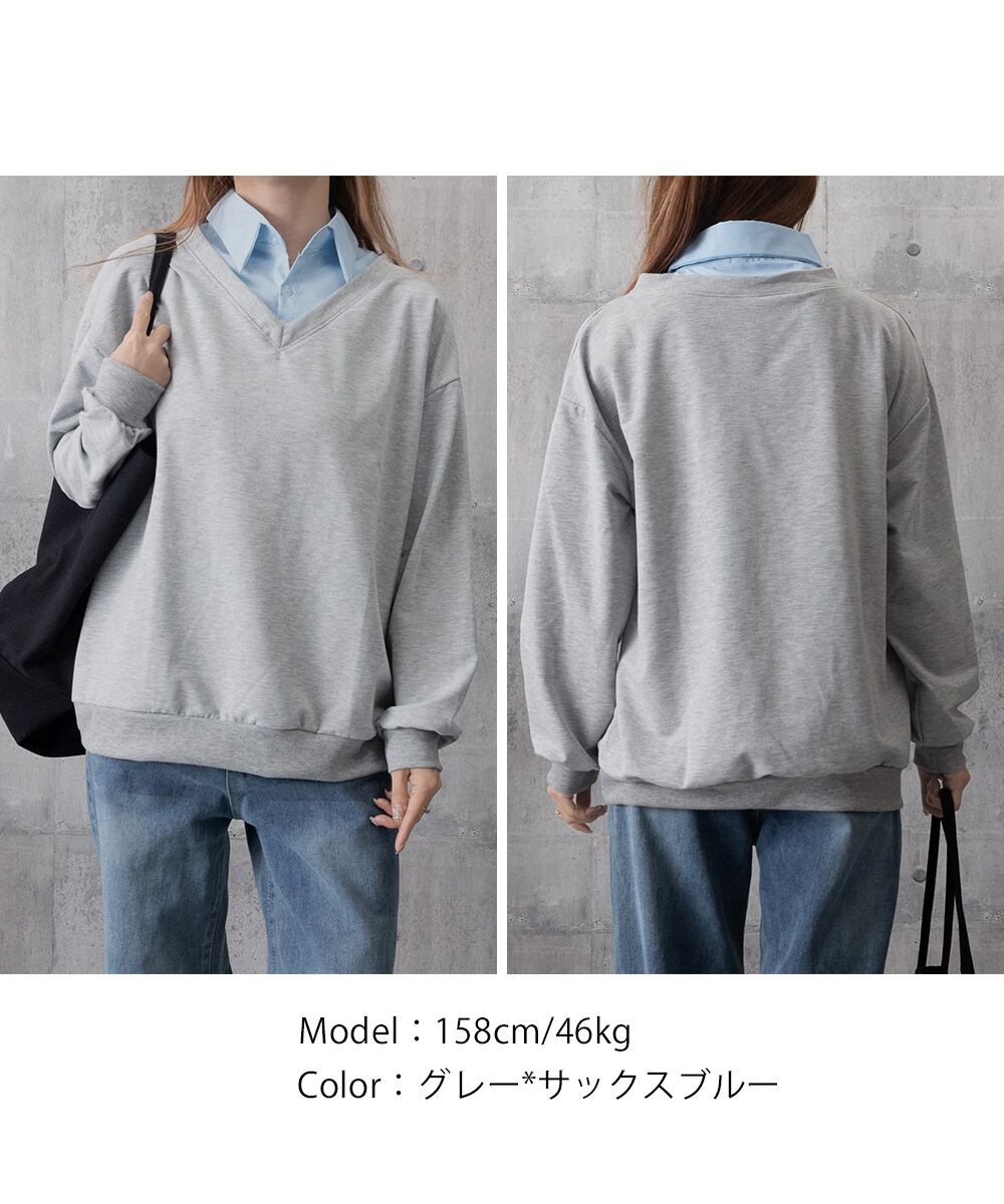シャツをレイヤードしたようなデザインが目を引く、Vネック仕様のドッキングスウェットトップス。